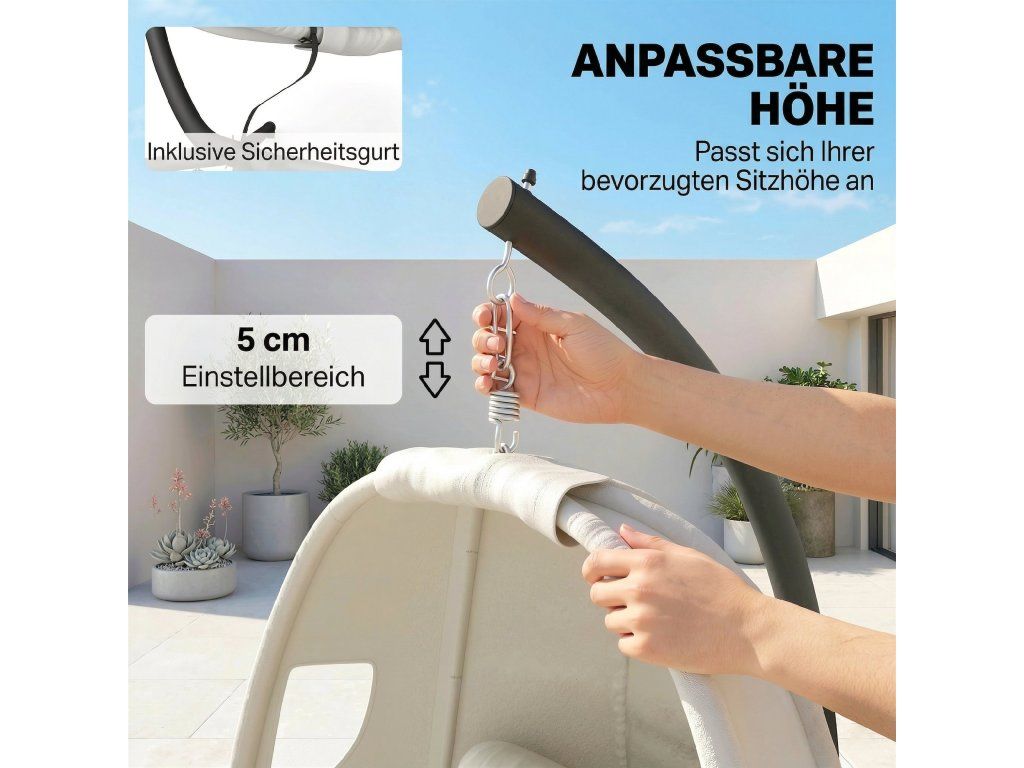 Stouplý, nastavitelný rám: Robustní, pozinkovaný a práškově lakovaný ocelový rám se čtyřnohou základnou poskytuje bezpečnou oporu až do 120 kg. Výškově nastavitelná konstrukce (rozsah 5 cm) a bezpečnostní pás zajišťují přizpůsobený a bezpečný zážitek z houpání.