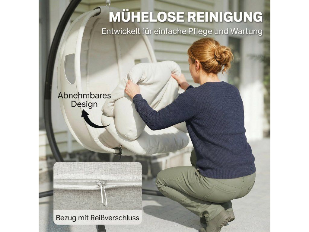 Plyšový jednodílný polštář: Užijte si maximální pohodlí s 20 cm silným jednodílným polštářem venkovního závěsného křesla, vyplněným měkkou bavlněnou látkou z polypropylenu. Snadno odnímatelný a pratelný potah zajistí, že vaše útočiště bude vždy svěží a příjemné.