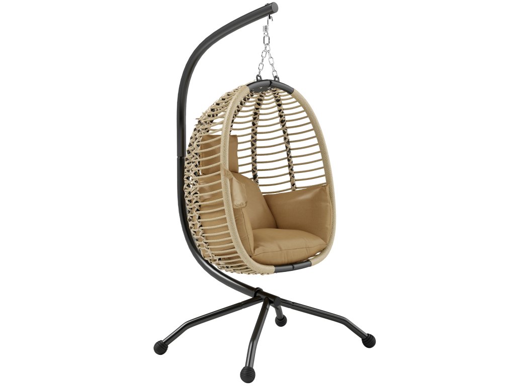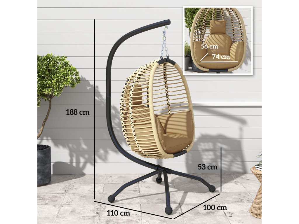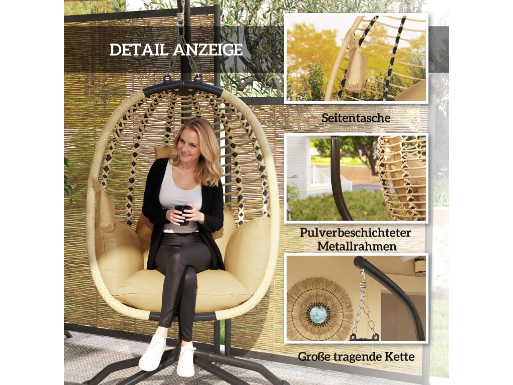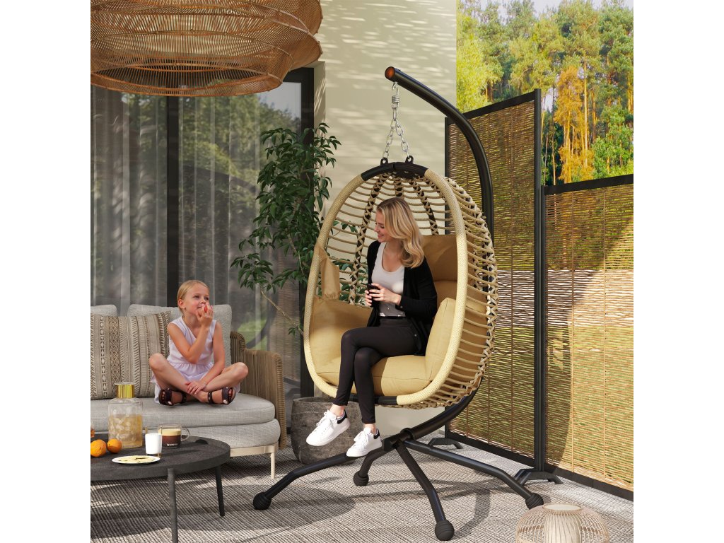 Závěsné křeslo Outsunny se stojanem, skládací závěsná houpačka ve tvaru vejce s omyvatelným sedákem, držákem na nápoje, bezpečnostním lanem, béžová