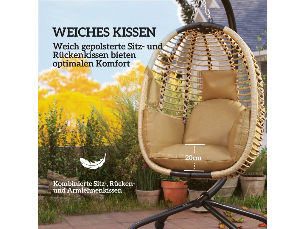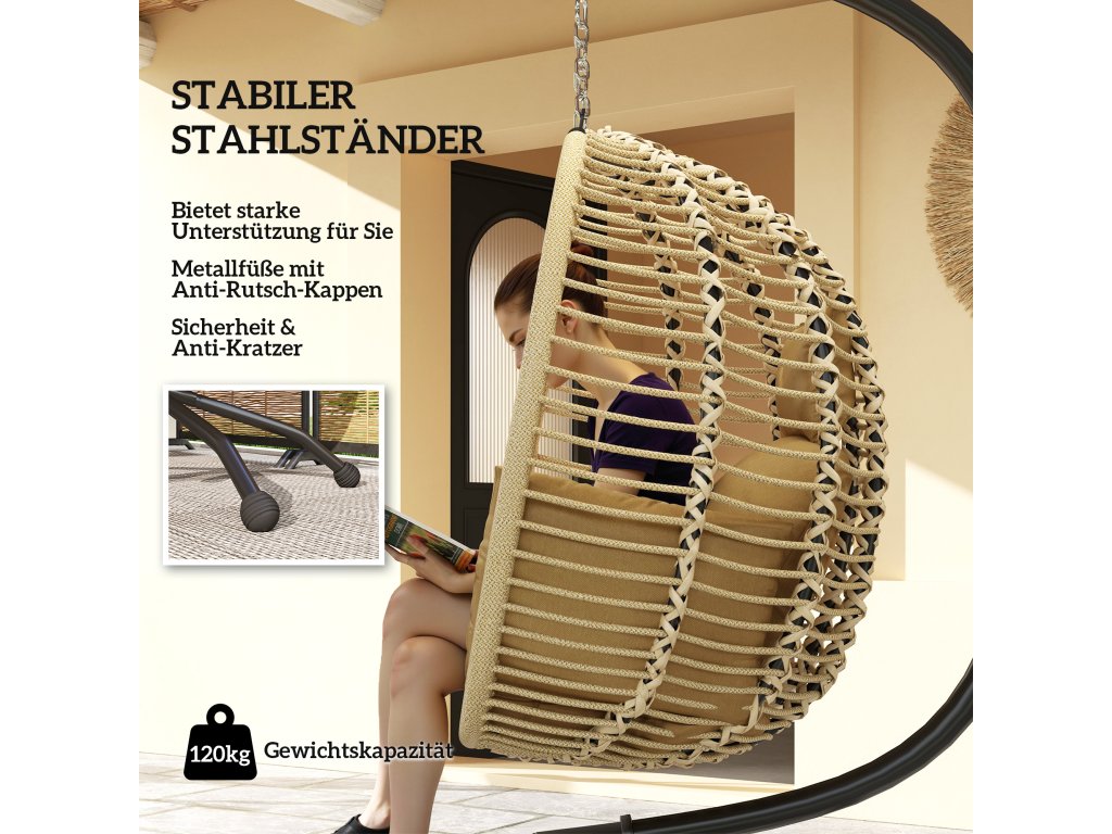 Velká sedací plocha: Sofistikovaný design závěsné židle nabízí dostatek pohodlného prostoru k relaxaci a odpočinku. Ideální do zahrad, na balkony, verandy – a dokonce i do některých vnitřních prostor. Vybavena bezpečnostním lanem pro větší stabilitu, které zajišťuje bezpečné používání za všech okolností.
