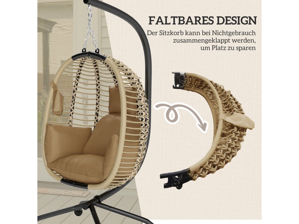 Skládací design: Tato venkovní závěsná židle se stojanem má skládací sedací koš, který lze kompaktně složit, když se nepoužívá, pro snadné skladování.