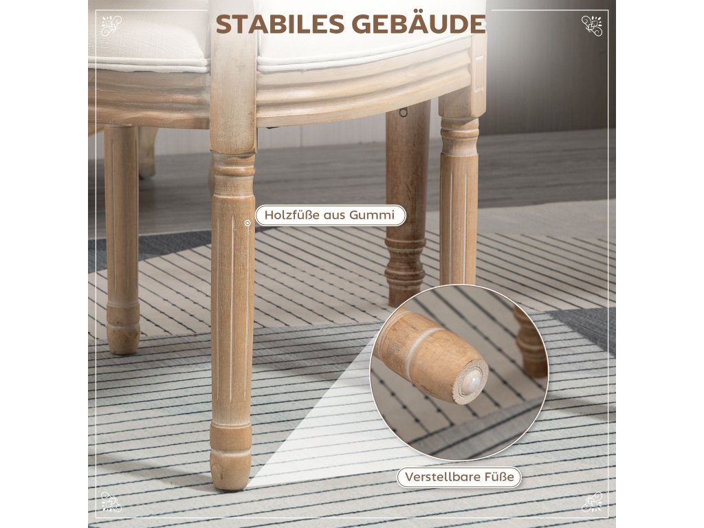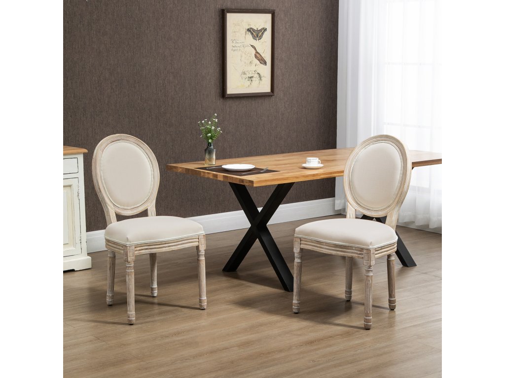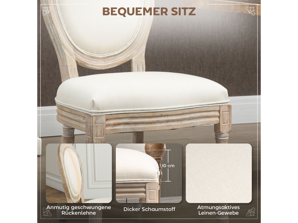 Vyberte si tyto jídelní židle od společnosti HOMCOM a vneste do svého domova eleganci. Jsou vybaveny měkkými polštáři z husté pěny a potahem z prodyšné látky v lněném vzhledu, takže vám nabídnou vysokou úroveň pohodlí. Díky kombinaci dřevořezby a kulatého designu vnesou tyto židle do vašeho obývacího pokoje a jídelny eleganci a styl.