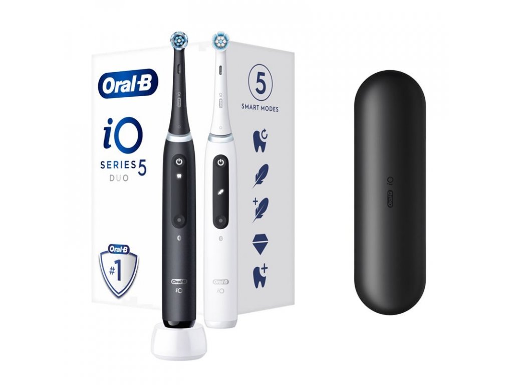 - Obsah balení: 2x rukojeť iO5 barva černá + bílá, 2 kartáčková hlavice Ultimate Clean, 1 cestovní pouzdro, 1 nabíječka, 1 držák na kartáčkové hlavy